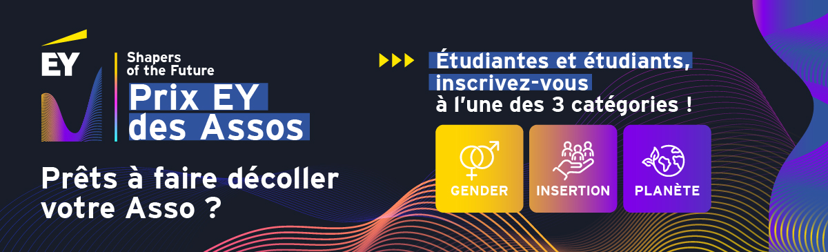 C’est le Prix EY du Meilleur Projet Associatif étudiant. Véritable tremplin, il vise à financer des initiatives engagées qui répondent à au moins un des enjeux stratégiques d’EY France : L’éducation et insertion professionnelle, environnement, l’inclusion